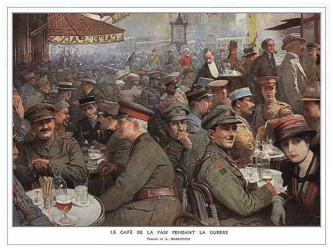 - the sidewalk terrace of the Café de la Paix in Paris during wartime.