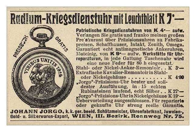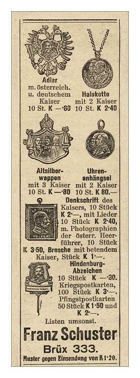 It was hardly uncommon for people on the home front to want to display their support for the war. Wearing patriotic jewelry, rings, cuff-links, lapel pins, tie-clips or watches was a very simple manner of do so. Manufactuors were quick to put all such kinds of cheap and expensive merchandize on the market. These items might be sold by street vendors or in places of business or in small shops and kiosks. They usually needed little advertising to sell, but from time to time advertisements can be found. The following illustrations all come from early war-time issues of an Austrian newsmagazine called 'das Intressante Blatt'.