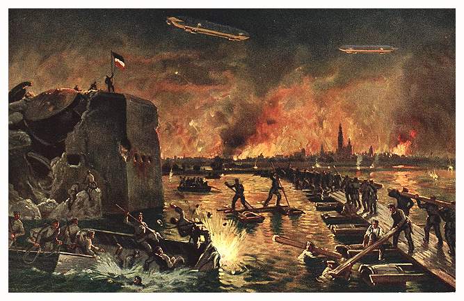 Another impressive but false view of the fighting around Antwerp. The pontoon bridge was built on large barges and not on small rowboats as illustrated here. Nor were there fortifications on the river Scheldt as depicted on the left. Furthernore, the Germans did not attack Antwerp from this side of the river. It is interesting to compare such hand-drawn illustrations with other illustrations from British magazines showing the bombing of Antwerp by Zeppelins. The British illustrations are quite accurately rendered, while these German views are very much less so.