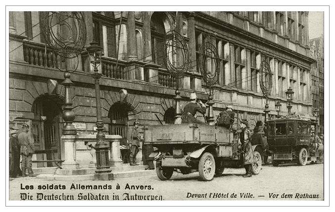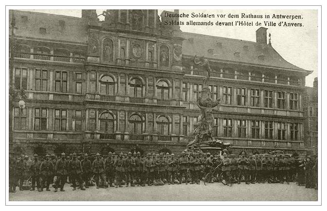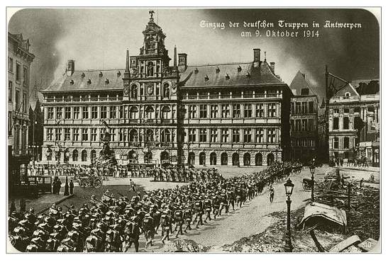 A photographic collage showing German troops marching across the Grande Place of Antwerp in front of the City Hall. For some reason the Germans liked to depict even greater destruction than they actually caused. For instance, in this postcard we can see bombed and burned houses to the right of the City Hall. In fact, no houses on this location were damaged at all.