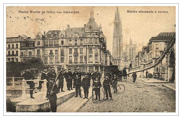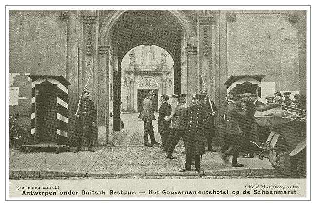 German headquarters in Antwerp. A Belgian policeman keeps an eye out while soldiers guard the building.