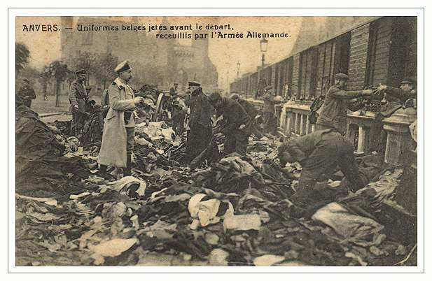 War booty : Uniforms and equipment left behind by the Belgian Army before crossing over the bridge of boats.