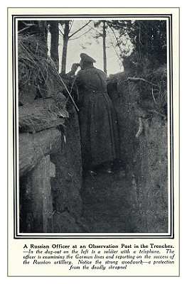 These houses are built of logs with roofs of thatch. The floors are simply bare earth. The ceilings and the walls are of plain wood, but on the latter are pasted many highly-coloured pictures of the Saints and of Jesus and the Holy Mother, also of well-dressed, clean-looking Russian soldiers devastating great hordes of the enemy. Such cottage rooms are not the most comfortable places to live in after, for instance, a sojourn in a big hotel, but palaces compared with the stuffy holes in the ground in which so many officers have made their winter homes.