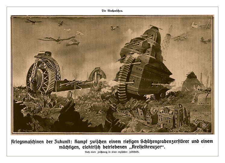 Needless to say, 80 years later, many of the prophecies and predictions appear to be quite silly, if not downright preposterous or comical. Here is an instance of the latter, taken from a 1916 issue of a German newsmagazine which re-printed the drawing from a British magazine, (presumably without respecting copyright). Apparently the appearance of tanks on the Western Front was an event that captured the imagination. And who was to say that tanks in the future would not grow to gigantic size, towering over the battlefield like a landed Dreadnaught ?