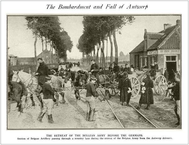 The time-fuse of one of the shells that were thrown in the Belgian lines, where it failed to explode is understood to have been set for 15,200 meters. This is about nine and a half miles, a larger distance than the Skoda howitzer is reckoned to cover. So it is possible that the Germans had even more powerful siege-artillery before Antwerp than is generally supposed. Something between a 12 in. howitzer and a 16 in. howitzer may in places have been employed. For the enemy was so anxious to reduce Antwerp with the utmost speed, and to release his army corps for operations between Lille and Dunkirk, that he massed every available machine of destruction against the Belgians.