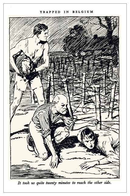 The church clocks in Holland were striking midnight, and we could see the electric lights on the Dutch roads 200 yards away. Our guide motioned us to lie down, and left us for about ten minutes. When he returned he took off all his clothes except his shirt, under-pants and boots, and told us to do the same. This was to make it easier for us to crawl through the wire. We tied up our discarded clothes and threw them over the top of the barrier, which appeared to be fifteen to twenty feet in width. It was thickly meshed and very close to the ground. Each of us then selected a spot and commenced to crawl through. This could only be done by lying flat on the stomach, stretching the arms at full length, grasping the wire and pulling the body forward two or three inches at a time. It took us quite twenty minutes to reach the other side. My underclothes were ripped to ribbons and my body smarted from head to foot where it had been torn by the barbs. We rested a few moments, then grabbed our bundles and made a bolt towards the lights in the distance. Five hundred yards further on we waded a ditch, stepped over a couple of strands of barbed wire, and saw a sentry in blue uniform a few yards away. We were in Holland. The sentry came up, patted us on the back and said: Goot Engleesh." We put on our clothes and an hour later were being cared for at a Dutch inn.
