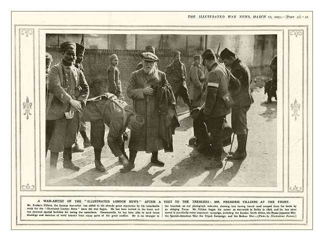 Frederic Villiers was one of the more famous British illustrators of his day and though relatively old in 1914, (63 years old) he produced many first-hand sketches and finished drawings of battle scenes and Allied soldiers in the trenches. Sometimes due to constraints of time and circumstances, his sketches would be sent in and finished into completed illustrations by other illustrators working in Great Britain. Several of his sketches turned into finished illustrations are to be seen in the links below. Artists such as Frederick d'Haenen, Michaels, R. Caton Woodville or Koekoeck among others would be chosen to finish Villiers' rough sketches into publishable works.