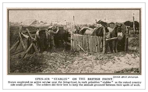 It often seemed, as though the Germans had neither the time nor the means nor yet the wish, to look well after their horses. The diet they gave them was evidently not suitable, as was shown by the number of horses found dead with widely distended bellies. It used to be said out at the front in fact, that a dead German horse could always be told from an English horse by his distended belly. British horses were fed largely on corn. The Germans gave their horses too much, green food.