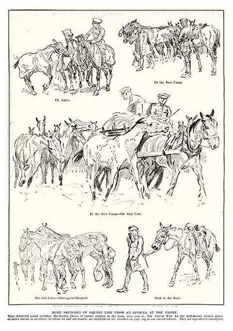 This simple, as affection of soldier the Cossack for his horse noticed and expressed by a writer who had spent some time among them, would find nowhere a more real sympathy than among the soldiers fighting for Great Britain. This was perhaps natural. British soldiers were no more than maintaining a national tradition. To the British race the horse had long been more than a mere animal. For centuries he had had a place in their sports and pastimes and pleasures as well as in their work ; and by sheer merit of his own he had won a place in the British mind not only as a faithful servant, hut also as a friend and companion.