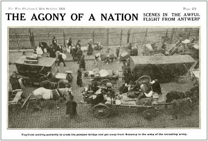 The scenes in all the townships and villages between Antwerp and Holland simply beggar description. Eckeren is sickening in its intense misery. Women of all ages are rushing about frantic with fear and misery; mothers looking for lost children gone astray in the panic; husbands searching for wives and little ones; old women totter along tire roads, moaning and wringing their hands; aged men, clinging to the arms of younger folk, stagger northwards, alternately praying to God and cursing the Kaiser. It is the most pitiful sights the sun ever looked down upon.