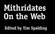 Perseus Encyclopedia. Links to ancient sources (all Pausanias). Translation and Greek text. Ancient History Sourcebook: "Mithridates & The Roman Conquests in the East, 90-61 BCE." Translated selections from Appian and Plutarch with introductory material (Paul Halsall). Plutarch, Life of Sulla. See also the Comparison of Lysander with Sulla (Internet Classics Archive). Plutarch, Life of Pompey. See also the Comparison of Pompey with Agesilaus (Internet Classics Archive). Sources, Latin and GreekLivy, Periochae (summaries of lost books). Latin text. See especially 100, 101 and 102. (Ad Fontes) Justin, Epitome of Trogus bk. 37. Mithridates' birth. See also books 38, 40 and 41 . (Ad Fontes) Florus, Epitome of Roman Wars especially bk 1, sections 40-42. (Ad Fontes) Velleius Paterculus, Roman History especially bk 2, sections 18ff. (Ad Fontes) Frontinus, Strategemata. All four books have at least one incident. AcademicAmazon. The Foreign Policy of Mithridates VI Eupator, King of Pontus by B.C. McGing (Mnemosyne Ser.: Suppl.89) Individual topics: PlacesZela Catholic Encylopedia. Web Archive: Sinop in Ancient Times by Leslie Payne Delaney (1960). Scanned by Bill Simons, who worked at the Army Security Agency station in Sinop, Turkey. Individual topics: Friends and OpponentsPompey from "Patheon of the World Brotherhood of Light" (nut-cases). Web Archive: Lucullus (short biography) from "Rome of the Caesars." Web Archive: Pompey (short biography) from "Rome of the Caesars." Individual topics: PoisonThe Herbal Tradition. "Poisons: the Foundation of Pharmacy." ArtPortrait head of Mithradates VI Eupator of Pontus as Herakles (from Perseus Project). Silver tetradrachm of Mithridates (from Perseus Project). Modern painting of Mithridates experimenting with poisons from "A History of Pharmacy in Pictures." Web Archive: Black and white of a coin (Forum Romanum). LiteratureRalph Waldo Emerson's poem "Mithridates" -- I love this. Finding it really justifies doing this site. Also here. Clark Ashton Smith (Lovecraft-pal)'s epigrammatic "Mithridates" James Joyce, Chamber Music 28: Though I thy Mithridates were, Novels that feature Mithridates from Fictional Rome. A short biography is also on the site. Housman, "Terence, this is stupid stuff" concludes with lines on Mithridates. If this link doesn't work try this one. Music