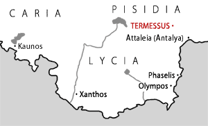 This website sorts and describes every history, travelogue and photo gallery I could find. It includes 50 links and 102 pictures of the site. These are divided into About Termessos, Travelogues and Photos, Tourism, and pictures of the theater and the rest of Termessos. ![]() Termessos in southern Turkey 16 miles/25 kilometers from Antalya. A Short History of TermessosTermessos (also known as Termessus) was inhabited by the Pisidians, an indigenous Anatolian nation of noted ferocity. The city first appears in history during the conquests of Alexander the Great. Alexander swept through the region but after winning a skirmish in the narrow mountain passes near the city, declined to storm it. (Guidebooks consistently portray Alexander as unable to take the city, but in fact he was merely disinclined to try.) After Alexander's death the city saw a famous clash during the wars of Alexander's "Successors." One of Alexander's generals, Alcetas, found himself trapped in the city by another of Alexander's generals, Antigonus the "One-Eyed." Beloved by the city's young people, Alcetas was betrayed by its "senior citizens" and comitted suicide rather than fall into Antigonus' hands. Mutilated and left unburied by Antigonus, Alceta's body was retrieved by the younger generation and given a hero's burial. The extant "lion sarcophagus" has convincingly been identified as his final resting place—among the only surviving graves of Alexander's friends and companions. In the Hellenistic period, Termessos gradually "Hellenized," adapting Greek culture, language and even becoming a democracy. The impressive theatre was built during this period, no doubt serving as both entertainment venue and political meeting place. Throughout the period, Termessos was engaged in frequent warfare with its neighbors, often taking on more than one. For its help in his campaign against Selge (c. 158 BC), Attalus II of Pergamum erected the city's elegant stoa (porch). Termessos passed easily into Roman friendship and later empire. The city received considerable autonomy for its role against King Mithridates. It guarded its privileges jealously; remarkably, its coinage never included either image or title of the Emperors. (This is the source of the tour-guide story that Termessos was never conquered by Alexander or the Romans!) Most of the city's buildings were erected in this period, including a temple to the Emperor Hadrian. At some point the city Christianized, and bishops from Termessos participated in the early church councils, but the city was abandoned between the 5–7 centuries. (Remoteness and earthquakes may have both played their part.) Except for the occasional nomad it lay empty after that, which explains its relatively pristine state. For a more detailed account of Termessos' history, see the Wiki Classical Dictionary. Get Involved!I tried my damnedest, but there must be more. Send me your pictures, your travelogues—I will list anything relevant. Thanks for coming! Tim Spalding Credits: Navigation bar photograph © Manfred Hiebl (www.manfredhiebl.de). Main-page photograph of the theater at Termessos © Jack Brauer (www.widerange.com). Map © Tim Spalding. |