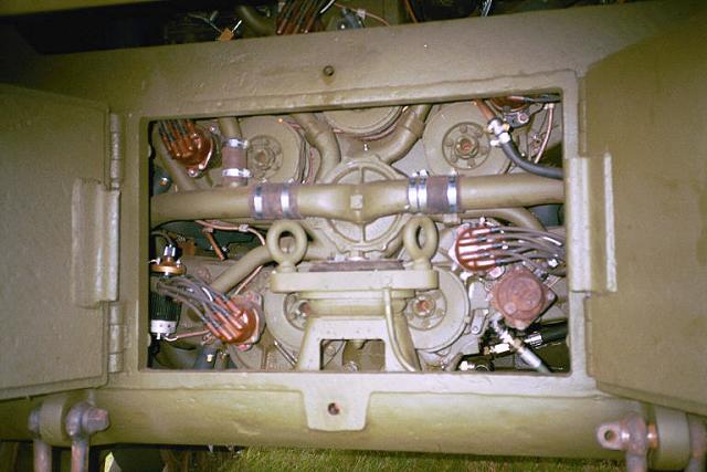 Our first view of the engine of Carl Brown's remarkable M4A4 Sherman. There are 30 cylinders here, five cranks, five distributors, five carburetors! Awesome piece of kit... and only the third known to be restored and running.