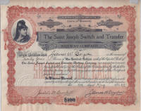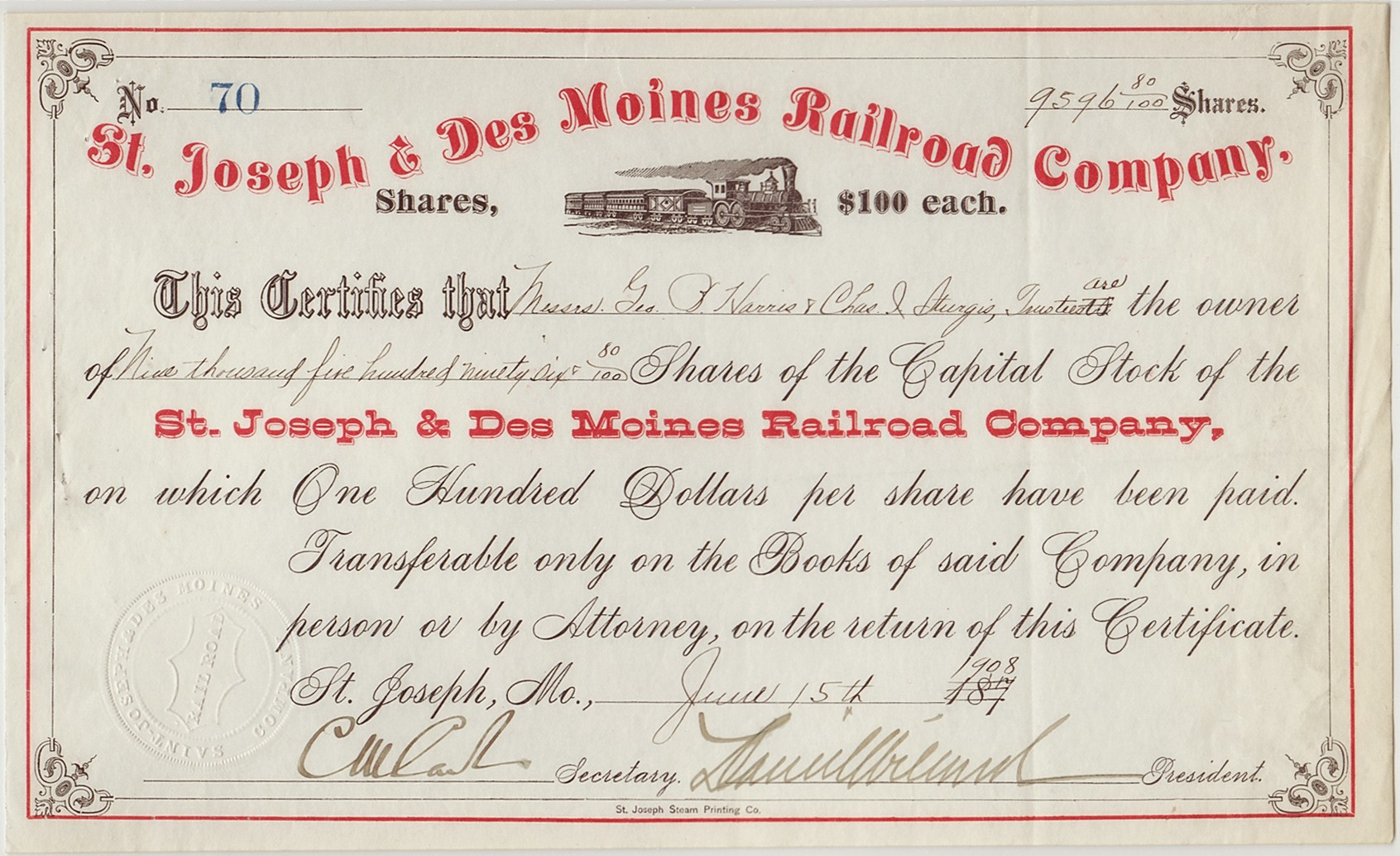Joseph & Des Moines Railroad Co. $100 Common Stock 9596.8 shares Issued date June 15,1908