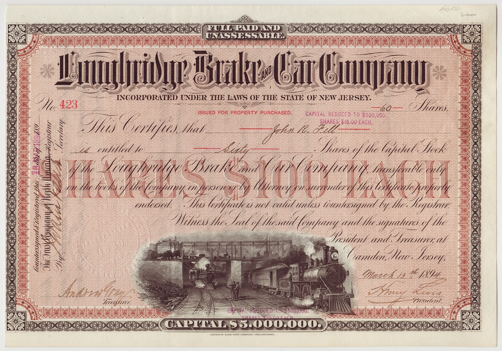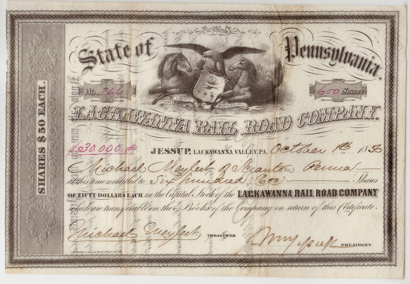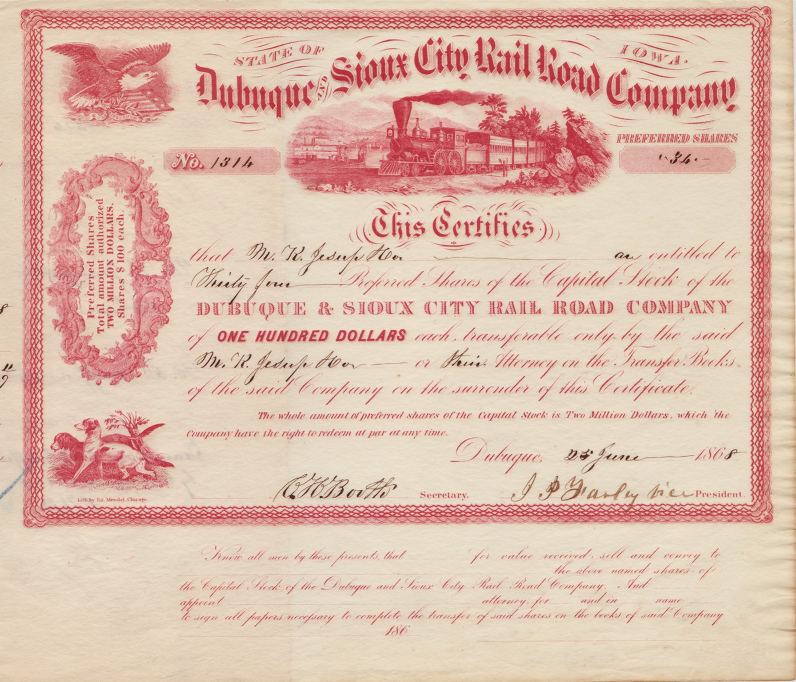 $100 Preferred Stock 34 shares Issued date June 2, 1868
