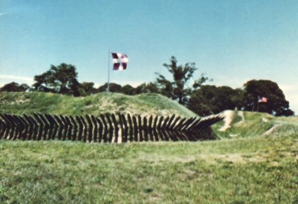 | Photograph of Yorktown Redoubts 9 and 10 that were seized on the night of 14 October, 1781, by French and American infantry. The above 1981 photo shows Redoubt 9 in the foreground, displaying the regimental flag of the G�tinais [Gatinois] Regiment. On occasion the redoubt displays the colors of the Royal Deux-Ponts in place of that of the G�tinais. To the right, the American Flag, indicates the relative location of what remians of redoubt 10 in the distant background. Both redoubts today are reconstructions, as over time many events wore down the original field fortifications. Redoubt 10, located on a small cliff on the right bank of the York River has suffered serious water erosian over the years.