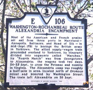 A March 1997 study undertaken by Exp�dition Particuli�re Mount Vernon Commemorative Cantonment, at the request of M. Jacques Kusseling and on behalf of the local Souvenir Fran�ais association. The study concluded with the hypothesis that the two northern runs depicted in both maps are one and the same. If this assumption is correct, the location of the French army camp in 1782 was roughly in a half-mile area, bisected by Washington Street, and to the north of Oronoco Street. A Virginia historic highway marker was placed there in October 1998 to commemorate the French army's 1781 and 1782 presence in the City of Alexandria. It was paid for by funds raised by the Washington, DC committee of the 'Le Souvenir Fran�ais', Mme. Anne-Marie Crosnier, Présidente.