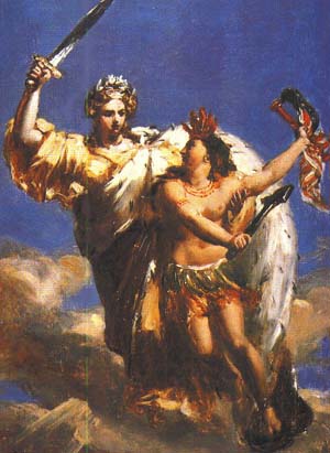 The eighteenth-century French painting presents an alegorical and idealistic view of the Franco-American alliance. France (represented in the form of a female 'diety') assists the young American nation (a female native of the 'New World') in obtaining its independence.