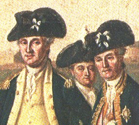 Detail from James Peale's painting [Washington and His Generals at Yorktown] shows Washington and Rochambeau wearing the respective black and white cockades for their armies that signified the unity of the French-American military alliance.