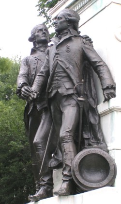 The monument is to commemorate the event that took place at the garrison in Metz, on 8 August 1775. Lafayette, as the young captain in the Régiment des Dragons de Noailles, attended an evening dinner on 8 August 1775, at the Govenror's Palace. The eighteen-year old marquis listened to the guest of honor, the duke of Gloucester (brother of the king of England) speak in rather positive terms of the rebelion in the American colonies. It was after this dinner, Lafayette decided that he would depart France and join the cause of American independance.