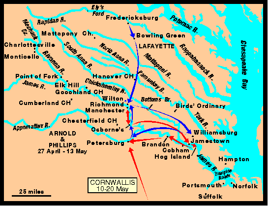 - Lafayette crossed the Potomac into Virginia, and arrived at Alexandria. Phillips' force was joined by Arnold's units as they passed Westover on the James, en route toward Petersburg and Richmond.