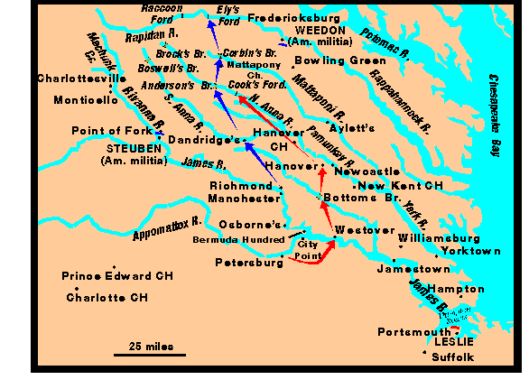 - Lafayette moved to Bottom's Bridge (16 miles from Richmond), across the Chickahominy River to a position closer to Wiliamsburg, Fredericksburg and to the vicinity of Jamestown, where Phillips was camped.