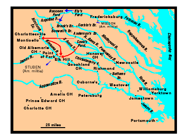 - Simcoe's units re joined Phillips in an advance of the British up the James River. Arnold took his units from Portsmouth to join in this distinctive 'James River Campaign'. Anticipating Phillips' and Arnold's objective, Rebel leaders abandoned Richmond. American military depot supplies were moved from Petersburg to Point of Fork (where Rivanna flows into the James River).