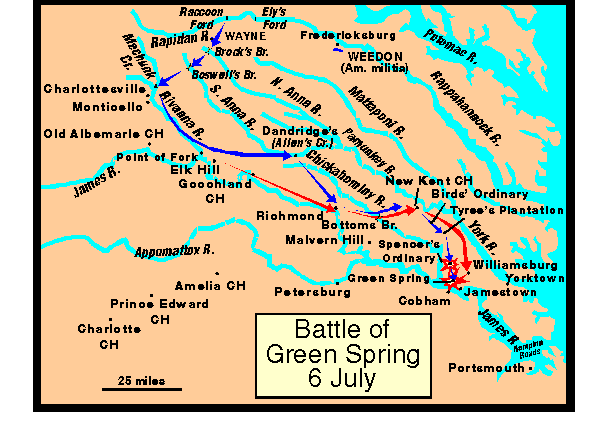 - It was all too temprting for Lafayette, who had been waiting for such a chance since being reinforced by Wayne, and then shadowing Cornwallis' movements back towards the east. Perceiving the false division of the British army, as Cornwallis had intended, Lafayette directed Wayne, with about 500 men, to advance upon what the Americans believed was only a small sized British rear guard positioned just southeast of Green Spring.