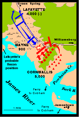 Lafayette is confused by Cornwallis' movements and divided his force: He bivouacked the main body of 2,200 at Malvern Hill (half way between Richmond and Williamsburg). Wayne, with small force (new Virginia recruits and some riflemen under Daniel Morgan) were sent to shadow Cornwallis' movements more closely.