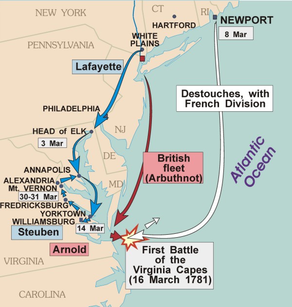 Washington strongly desired to capture Arnold, whose treason had made his operations in Virginia especially irksome. In February 1781, responding to pleas from Virginia, Washington deployed the American Major General, the Marquis de Lafayette, to Virginia with a small force of 1,200 men in an effort get Arnold. Washington's plan called for Lafayette's force to join up with a French division, under Viom�nil. The French division was to be delivered in Virginia by a French naval squadron, under Destouches, from Newport, RI.