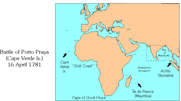 Chevalier-commander André de Suffren, a well experienced seaman, led a French naval squadron out of Brest at the same time De Grasse's larger fleet deployed to North America in 1781. Suffren's squadron headed toward the Indian Ocean. Enroute, he surprised and seriously damaged an English naval squadron at La Praya in the Cape Verde Islands (16 April 1781). Suffren then went to the Dutch colony at the Cape of Good Hope and off loaded French troops to aid in the defense. Proceeding east, around the Cape, Suffren joined with another French squadron at Île de France [Mauritius], a major French port in the Indian Ocean. The French fleet proceeded east to the Bay of Bengal, where Suffren would for nearly two years maneuver and fight against much better provisioned British naval formations. Suffren's only shore assistance was from the Indian Mysore leader, Hyder Ali, who was also fighting the British, and use of small Dutch ports in Ceylon.