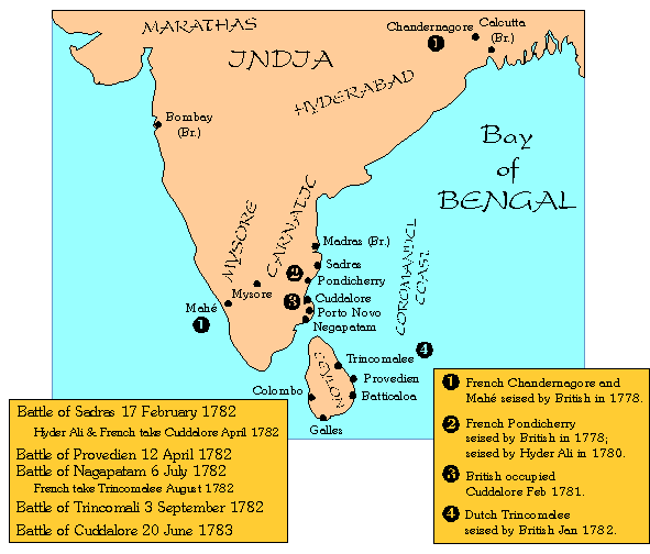 - Suffren (12 ships), confronted Admiral Edward Hughes' British squadron (9 ships) off Madras (on the Coromandel Coast of India) in the 'Battle of Sadras'. [Sadras is a small town south of Madras, the major British-held port. Some refer to this battle as that of 'Madras'.] Though neither side lost a ship, the mutually inflicted damage to their squadrons caused both naval commanders not to continue the engagment the following day. Hughes headed for Trincomlee (northeast coast of Ceylon) for repairs. Suffren went to Pondicherry (immediately south of Sadras), which had been recently retaken from the British by Hyder Ali. Suffren quickly made repairs, and in March continued on his mission to deliver French troops south of Porto Novo, a small town south of the British-held port of Cuddalore. The French captured Cuddalore on 4 April.