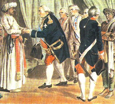 Admiral Suffren meeting with Hyder Ali, his ally and leader of the Mysore revolt against British rule in India. Color engraving by J.B. Morret, Bibliothèque Nationale