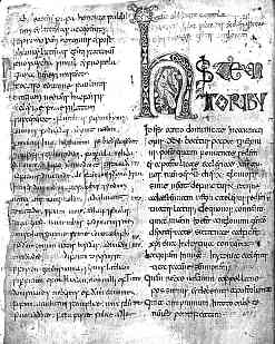 | The page shown is the beginning of Book Two, which begins with the death of Pope Gregory. There are, in fact, three different versions of insular minuscule script on this page, as the main text, which begins with the decorative heading in the second column, is preceded by some commentary or gloss in two forms of script that are more pointed than the main text. The exercises in this section are based on the script of the main text. | |