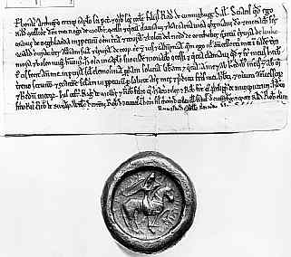 | The charter is written in a protogothic document hand of English type. The seal is attached with a parchment tag. It is dated to between 1177 and 1187. | ||