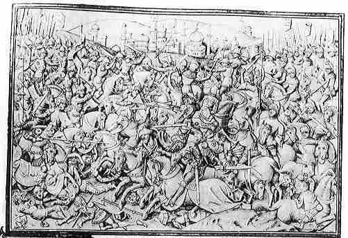 | The fine details of the grisaille miniature do not show up very well on the screen, but you are not missing out on the colour, as these were very finely drawn monochrome illustrations. In this rumbustuous and very crowded battle scene, it is notable that the armour and horse trappings are entirely 15th century rather than from the time of Charlemagne. This type of anachronism was quite usual in medieval manuscript illustration. |