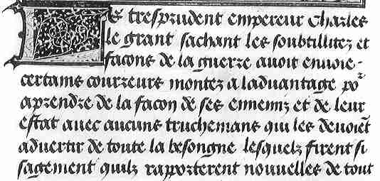 | Conquêtes de Charlemagne, 1458 (Brussels, Bibliothèque Royale, MS 9066-68, vol.1, f.138b). All images from The New Paleographical Society 1904, plate 44. |