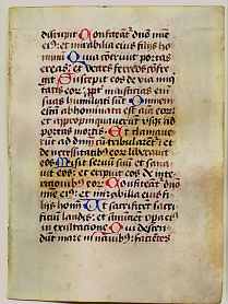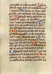 This shows the recto and verso of a leaf from a psalter from Germany, from around 1500. The volume that it came from was clearly not an elaborate prestige edition, not was it, I suspect, a service book for reading aloud in church. The small size, compact and relatively informal script with numerous abbreviations, and crammed lines suggest that it was more likely a work for study and learning in private. The clergy were supposed to know their psalter by heart. The only reading aids, on this page at least, are alternating simple red and blue penwork capitals at the beginning of each verse. The script is a Gothic textura, somewhat irregular and a little untidy, but quite legible. The page is a sturdy but smooth and white vellum which shows the ruling lines and pricking marks for laying out the text. You might just have to believe me on the last, as they are a bit hard to get to show up on a digital image. The script is perhaps a bit conservative, as by this date the French bâtarde and humanistic scripts had spread around Europe. The language is Latin and the text is from Psalm 106 (107 in a modern Bible). There are two different Latin Vulgate versions of the Psalms found in common use. This version of the Psalms can be found at the Vulgate (Latin Bible) Index website or the Douay-Rheims Latin Vulgate Bible site.. |