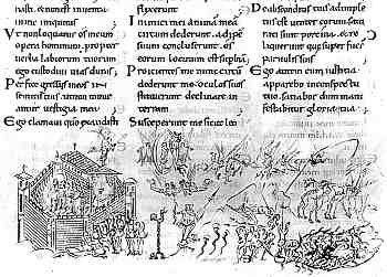 | This shows the lower section of a page from the Harley Psalter, an early 11th century codex produced at Christ Church, Canterbury. It is, in fact, a copy of the Utrecht Psalter, a Carolingian book made near Rheims around 820. The many intricate miniatures are copied from this earlier exemplar. There is more than one scribal hand in the book. This page shows a very neat and legible Caroline minuscule script. The Latin text has many differences from the standard Vulgate translation. The text shown here is from Psalms 16, which corresponds to Psalms 17 in a modern Bible. |