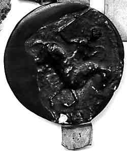 The seal is a rather battered specimen and the inscription has been obliterated. The side shown is the equestrian side, the king in majesty being depicted on the other. |