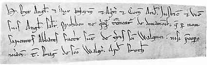 This very brief document is a writ of Henry II which formerly belonged to Takeley Priory. It is addressed to the justices and sheriffs of England, and the king forbids anyone to accept gifts of lands belonging to St Walery from unwise abbots. There has got to be a good story here somewhere, but I don't know what it is. It is a nice example of the brevity of a writ, as compared to the more florid language of a charter. The script is a protogothic chancery hand, of similar type but rather more informal to those used for charters of the period. However, many charters for the benefit of monastic houses at this time were not actually scribed by the chancery, but were written in the monasteries themselves, utilising book hands or charter hands of a more ecclesiastical character. It is interesting that this document belongs to a set which includes several charters pertaining to the monastery, none of which were written in chancery hand. The script is very angular and spiky. For some reason this entertains me, as Henry II was a cantakerous and spiky character himself (Remember, "Who will rid me of this turbulent priest?"), and somehow the writ looks like something that was snarled to a hapless chancery clerk in a fit of temper. And did he really say "unwise abbots" or something more vulgar? OK, so we're not supposed to get too carried away with the imaginative reconstruction. Part of the seal for this document evidently survives, but it is not illustrated. |