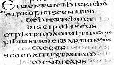 | Note that although the words run together within each line, individual words do not run over the ends of thenlines, and the lines are not crowded. The distribution of words is set out as a guide to reading aloud, with pauses at the end of each line for sense, a system referred to as per cola et commata. One superscript correction is visible in this section of text. | |