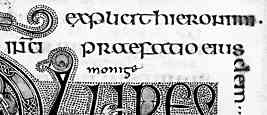 | The second section is the explicit from St Jerome's letter to Pope Damasus and the incipit to the preface. The insular half uncial script is essentially the same as that of the main text. The trick of having a heading take a sudden vertical dive at the end of a line is a feature of the manuscript. |