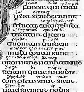 This continues the text of the preface. Even if you are not so expert at Old English of the Anglo-Saxon era, you should be able to make out the words the godspellere as the gloss above the Latin word euangelista in the third line. |