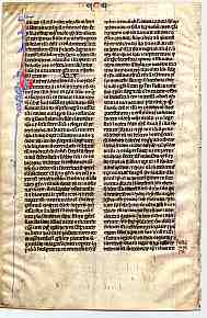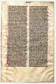 This shows the recto and verso of a leaf from a 13th century French portable Bible. These were produced in some numbers, and set certain standards for Bible production. They had running headers to indicate the names of the books, which were divided up into numbered chapters. The script is an extremely tiny simplified Gothic, derived from textura and entirely similar to that used for glosses around the edges of the main text in some Bibles and academic books. In general, the production was fairly plain with no miniatures, but tiny historiated initials were dotted in among the pages. This leaf has only fine red and blue penwork initials. The text of this leaf is from the Book of Ecclesiasticus or The Wisdom of Jesus Son of Sirach, Chapters 43 - 45. This is part of the Old Testament Apocrypha; those books of the Bible that were excised by Jerome when he translated his Vulgate because they had no Hebrew text, so that he considered them to be not authentic. The church authorities popped them back in again just in case he was wrong about that. They are included in modern Catholic Bibles, but not Protestant ones. The recto has a barely visible piece of Latin graffiti, written in a relatively modern hand, in the lower margin, but it is so faded that it is only possible to pick out a few words. It just shows that these old books continued to have a life of their own, long after serving their initial purpose. I have illustrated this in the text section, as well as the means for making nearly invisible old writing legible again without committing atrocities on your manuscript. Given how long and dense this is, we will just concentrate on a segment from the verso, from the beginning of Chapter 45. The Latin text of this section can be found at Sacred Texts, but if you look carefully you will find a number of small variations from the text as written here. The translation has come from The New English Bible: The Apocrypha 1970 Oxford University Press, Cambridge University Press |