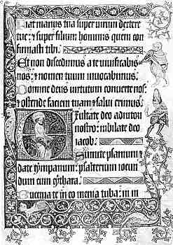The Luttrell Psalter represents something truly awesome in the development of posh manuscripts produced by private commission, having been produced for Sir Geoffrey Luttrell around 1340. Every page is lavishly decorated and the Gothic textura prescissa script, while bold and legible, is nevertheless painstakingly produced. It is regarded as one of England's national treasures, which may have either delighted, amused or irritated Sir Geoffrey. This page shows the end of Psalm 79 and the beginning of Psalm 80 in the Vulgate version, corresponding to the end of Psalm 80 and the beginning of Psalm 81 in a modern Bible. |