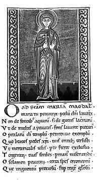 The Melissande Psalter was made between 1131 and 1143 in Jerusalem, Palestine. It was probably made for Queen Melissande, daughter of Baldwin and wife of Fulk of Anjou. We are getting a glimpse of an item of western European culture in what must have seemed something of an outpost in a strange land, despite it being the spiritual heart of European religion. The script of the Latin text is a form known as rotunda, or alternatively Roman minuscule. It was used in Italy and was a broader and more rounded type than the angular Gothic styles of more northern parts. In fact, the letter forms differ little from those of its predecessor, Caroline minuscule. This page shows the first page of a prayer to St Mary Magdalene, a popular saint in the middle ages as she represented the redemption of sinners. |