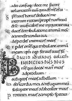 This is a leaf from a late 10th century psalter, probably written in Winchester for the use of Ramsay Abbey in Huntingdonshire. The script is a very clear and bold Caroline minuscule, in the style that old paleography books refer to as a "fine liturgical hand". The heading is in a form of rustic capitals, with a decorative initial B bearing acanthus leaf ornament. The Latin text is the end of Psalm 142 and the beginning of Psalm 143 in the Gallican translation, equivalent to Psalms 143 and 144 in a modern Bible. There are numerous abbreviations, indicating that the process of abbreviation in no way diminished an important text in a high class volume, nor did it decrease the legibility of a work designed for reading aloud in public. |