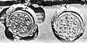 | Detail of the lead seals of the papal privilege of Pope Leo IV shown above. (From Steffens 1929) | |||