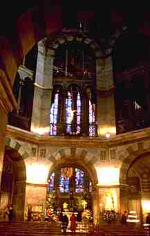 | The architecture of Byzantium combines with the barbarian splendour of gold mosaics and a jewelled gold altar in the Palatine Chapel of Charlemagne at Aachen. | |||
